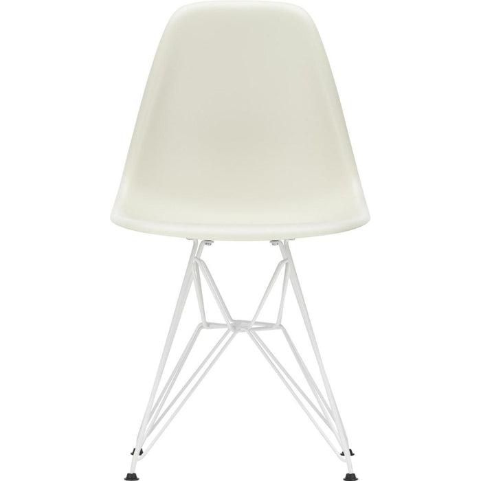 Introducing the Eames Plastic Chair DSR in a stylish 11 Pebble color with a sleek white base, designed by the iconic duo Charles and Ray Eames. This dining chair, originally conceived in 1950, showcases a beautifully molded plastic seat mounted on the renowned Eiffel Tower base, a robust steel structure that combines elegance with stability.