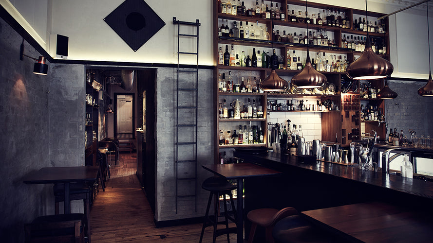 St. Pauls Apothek in Aarhus features a sophisticated interior that blends historic charm with modern elegance. Dark wood paneling, vintage-inspired furnishings, and ambient lighting create a warm, inviting atmosphere, while high ceilings and large windows flood the space with natural light. A polished wood bar with brass accents serves as a focal point, complementing the deep green and gold palette for a timeless, refined feel.