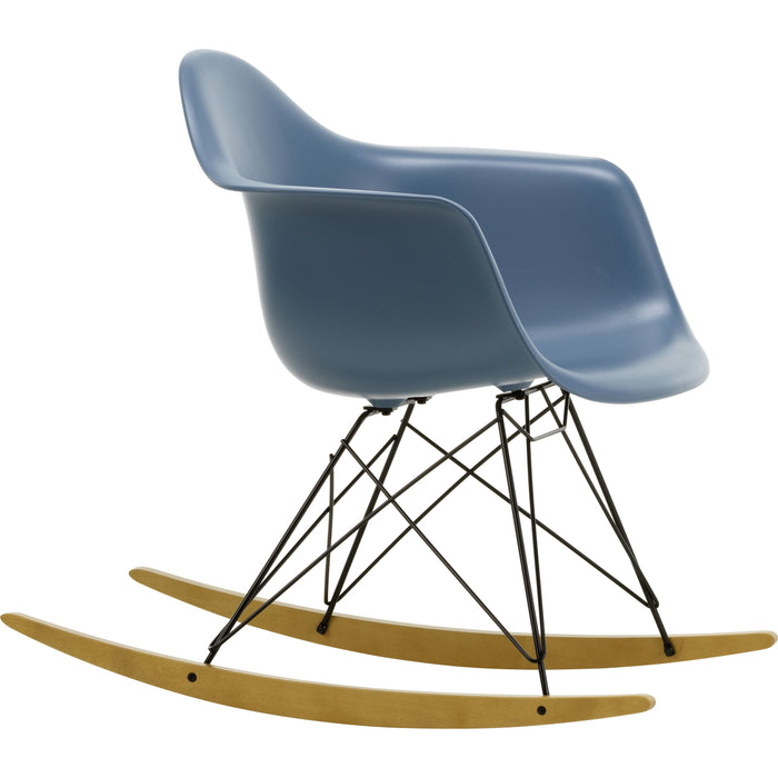Introducing the Eames Plastic Armchair RAR in a stunning 83 Sea Blue finish, complemented by a sleek Basic Dark Base and elegant Golden Maple accents. This iconic rocking chair, designed by the legendary duo Charles and Ray Eames in 1950, seamlessly blends mid-century modern aesthetics with contemporary sustainability.